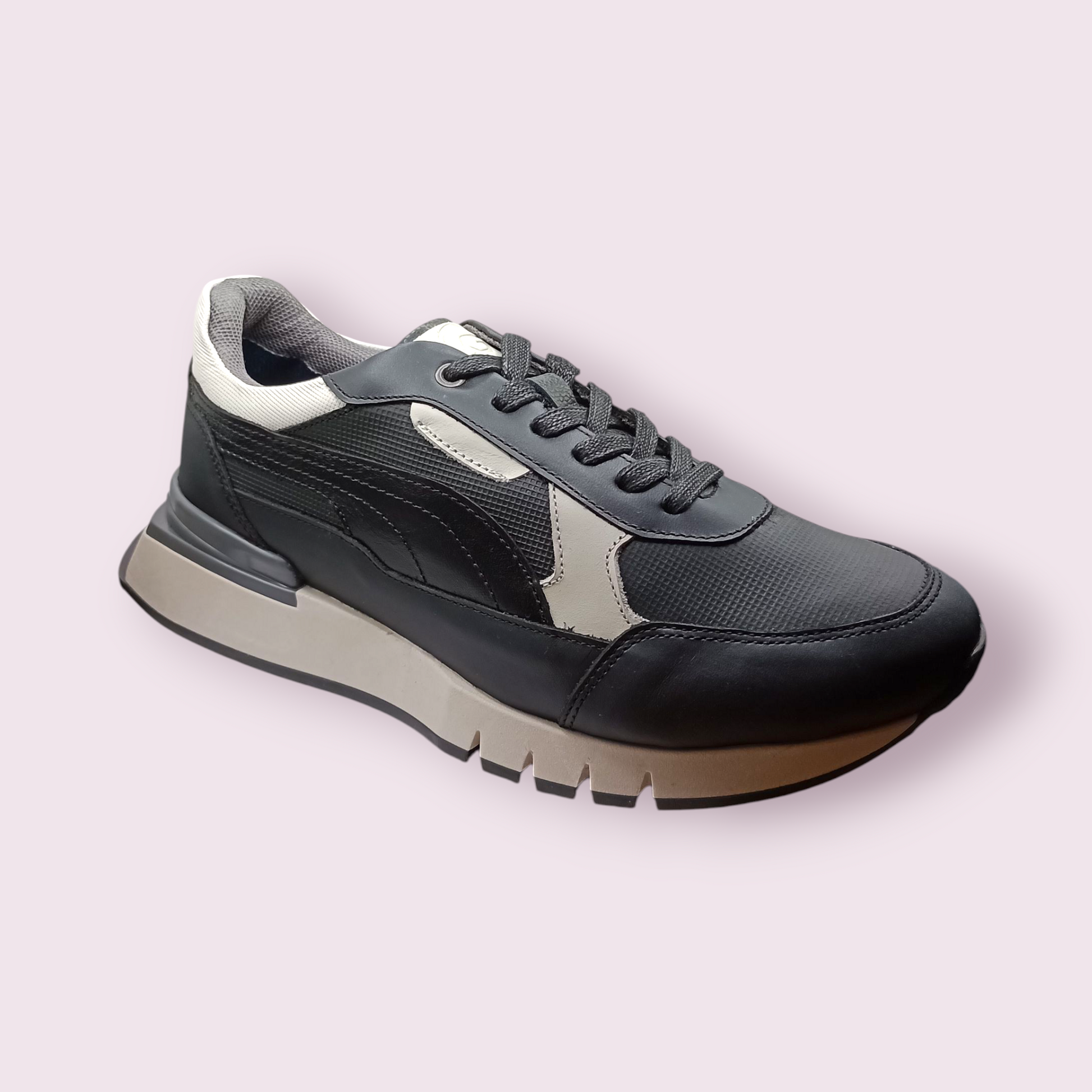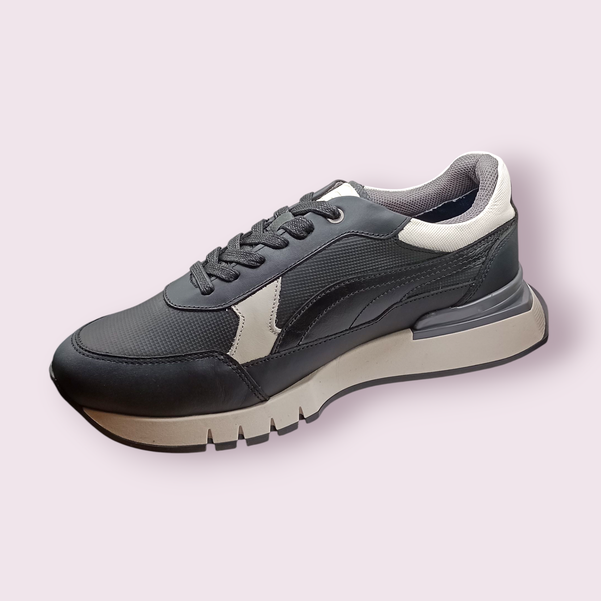 El zapato Alicante Negro está elaborado en cuero negro de alta calidad, combinado con detalles blancos que realzan su diseño sofisticado. La suela blanca completa un estilo moderno y ofrece durabilidad y confort para el uso diario. Perfecto para quienes buscan un calzado elegante y resistente.